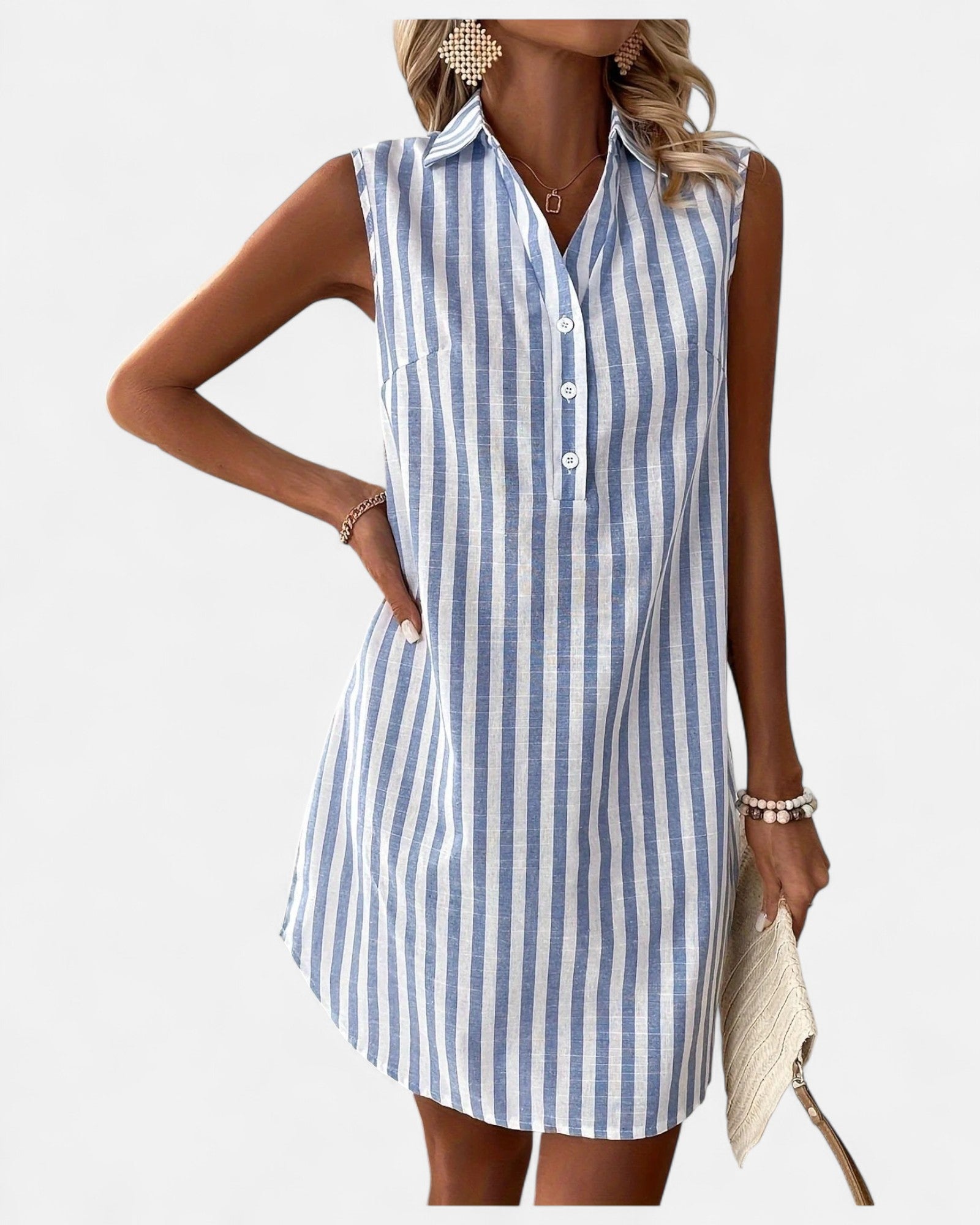 Sublinează-ți stilul cu Aureliana - Rochie camasa cu dungi, un element esențial care îmbină farmecul atemporal cu confortul absolut. Materialul său ușor și respirabil, împreună cu croiul lejer, face ca această rochie să fie tovarășul perfect pentru zilele însorite. Ușor de purtat, oferă un aspect elegant fără efort, atât în oraș, pe plajă, cât și în timpul ieșirilor de vară.
