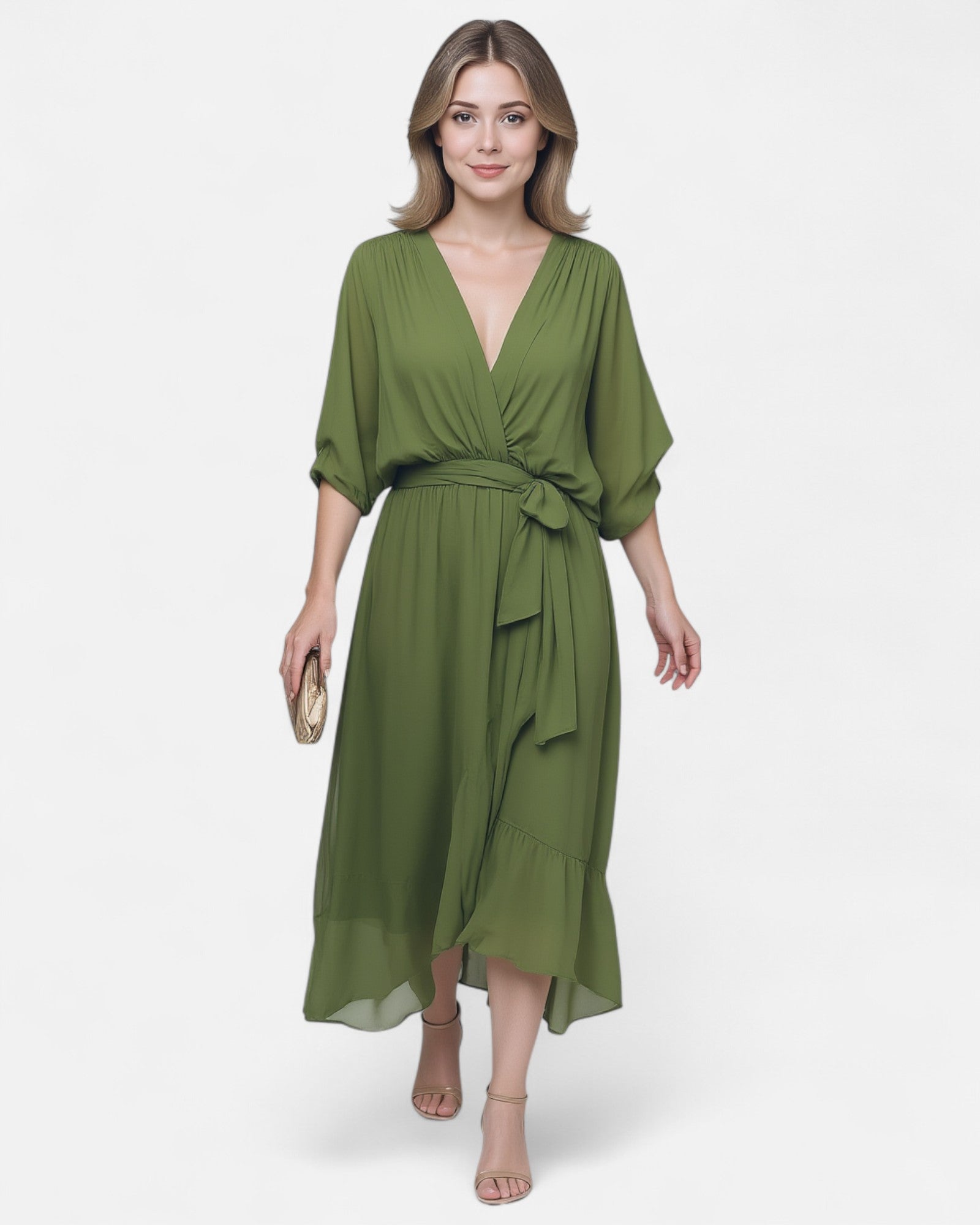Aurora™ | Rochie midi din chiffon în stil înfășurat aduce un aer elegant și ușor aspectului tău. Datorită silhuetei delicate înfășurate, mânecilor semi-transparente și tivului asimetric, subliniază grația feminină – perfectă pentru ocazii de vară, cine romantice sau evenimente festive.