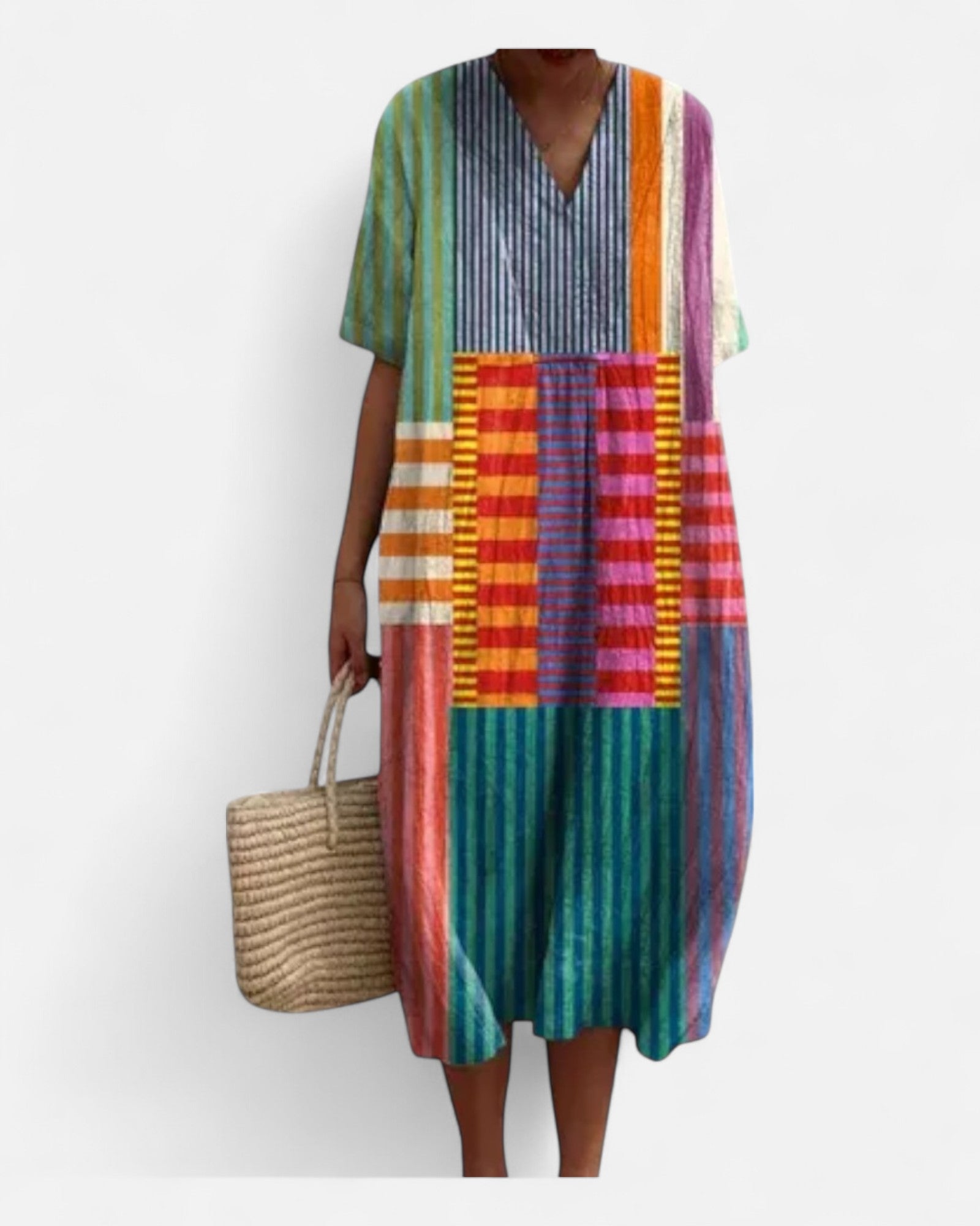 Rochia Chelo combină confortul bumbacului cu un model artistic inspirat de stilul vintage. Imprimarea sa geometrică adaugă un accent distinctiv și rafinat, ideal pentru femeile care caută un stil autentic. Datorită croiului avantajos și țesăturii ușoare, această rochie este perfectă pentru orice ocazie, de la plimbări casuale la evenimente speciale. Designul său atemporal și original te va face să te evidențiezi cu o eleganță unică.